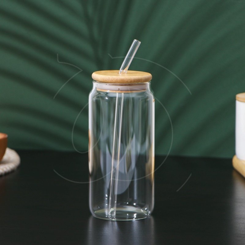 Стакан стеклянный с трубочкой и бамбуковой крышкой 500 мл